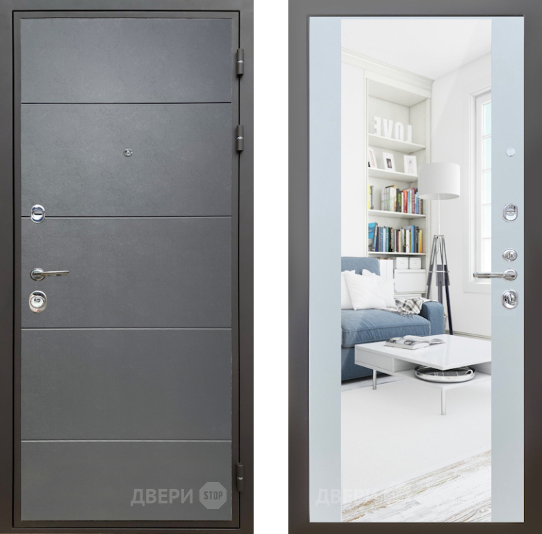Входная Дверь Шелтер (SHELTER) Комфорт Лофт графит 13 с зеркалом Белый матовый 860x2050 мм